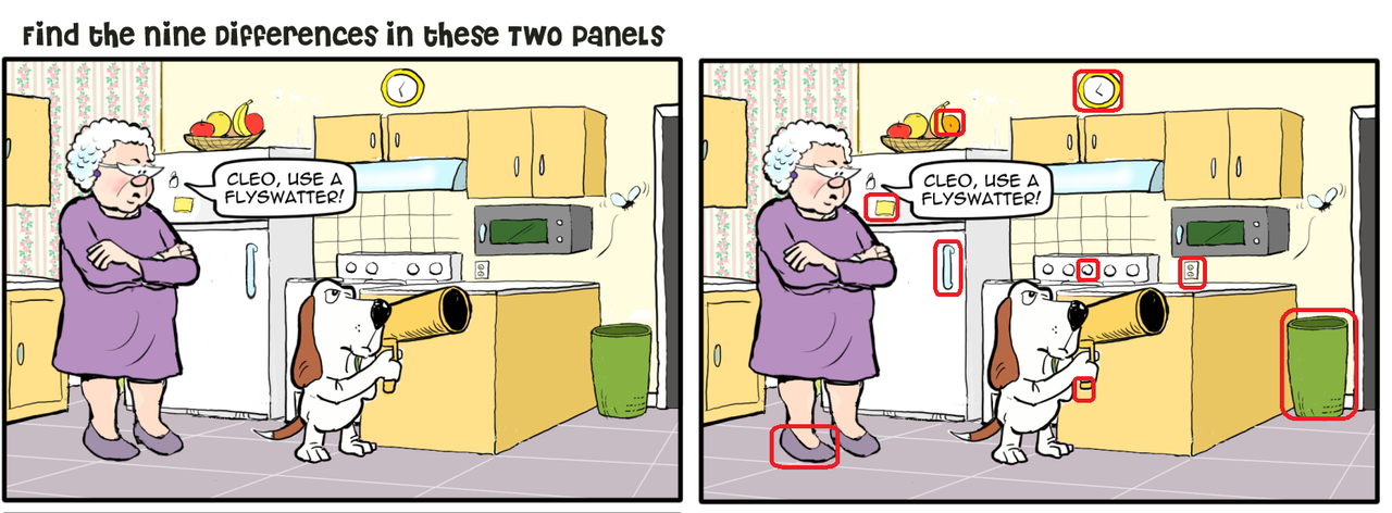 Clara should not stand in back of that bazooka. I was lucky today. It only took about 15 minutes to find all the differences. I guess Claude was scared to come in the kitchen.