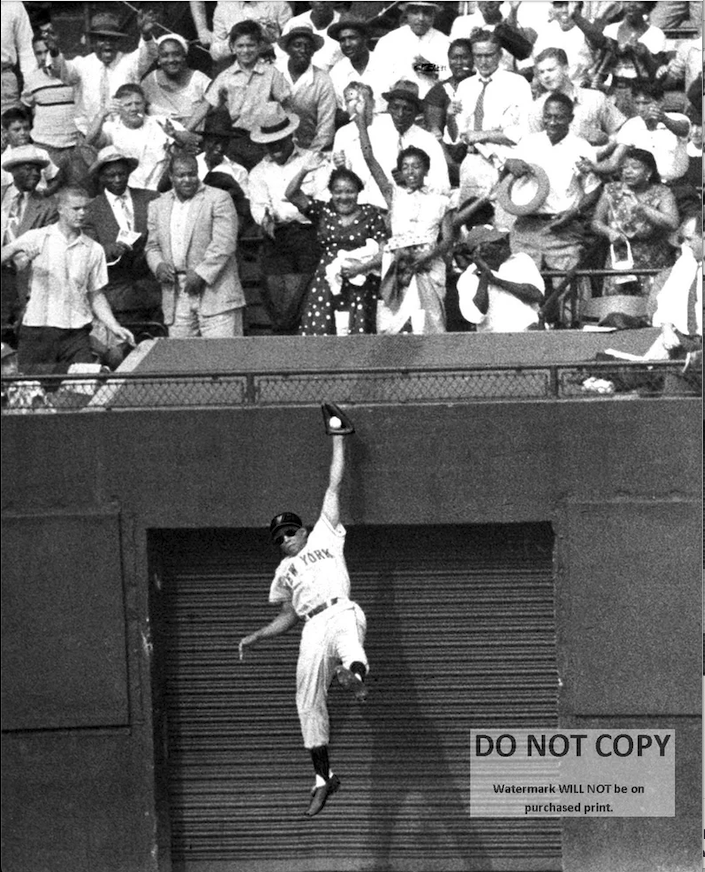 Willie Mays, leaping to catch a Duke Snider hit at Ebbets Field on August 15, 1954.