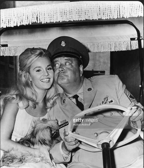 Jackie Gleason this time is wearing a military uniform, and Tuesday Weld holds a Pekinese dog in her lap, while he drives a golf cart on the set of director Ralph Nelson’s 1963 ‘Soldier in the Rain’.