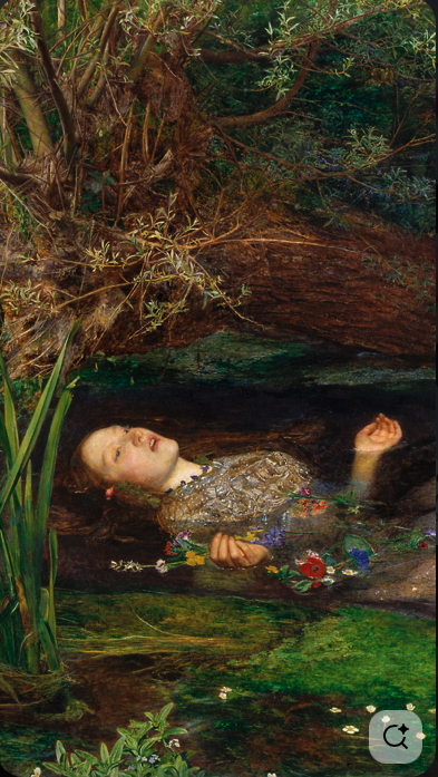 Detail of “Ophelia”, 1852, by founding Pre-Raphealite English painter John Everett Millais, a work sometimes used to represent the ideals of the movement.