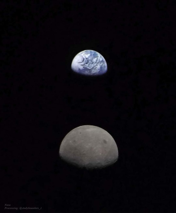 The earth and the moon, taken in late 2022, by the robotic Orion spacecraft of NASA’s prior moon mission, Artemis I, as it looped around the moon, and turned its camera back towards home.