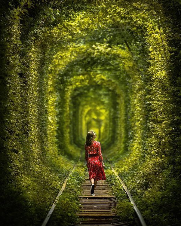 Supposedly a real place in Ukraine, called the Tunnel of Love… though I would bet that the lady and probably some of the lighting effects have been added with Photoshop or AI, as both are brighter and more clear than what I found in other images.