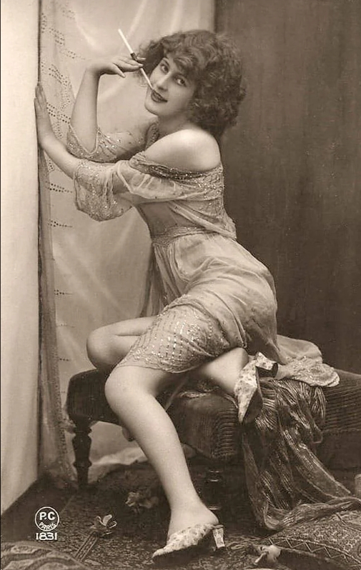 A naighty French postcard, of a vintage that a WWI doughboy might bring home, hidden in his pack.