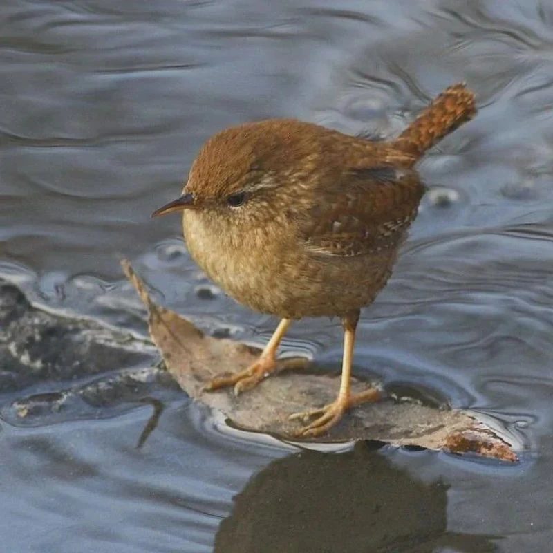 Pacific Wren surfing on a leaf.