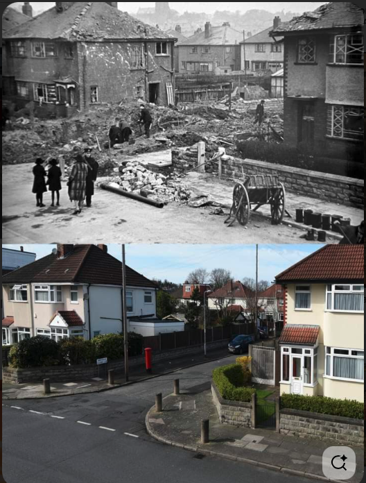 Early 1940s, after the blitz and how it looks, rebuilt, in 2022.