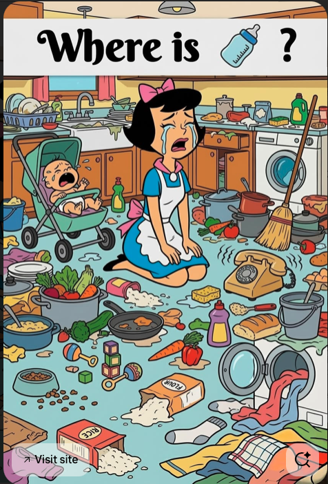 Food purposely spread out all over the floor, interspersed with all kinds of soap and cleaners? The baby’s teething rattles next to the spilled kibble?