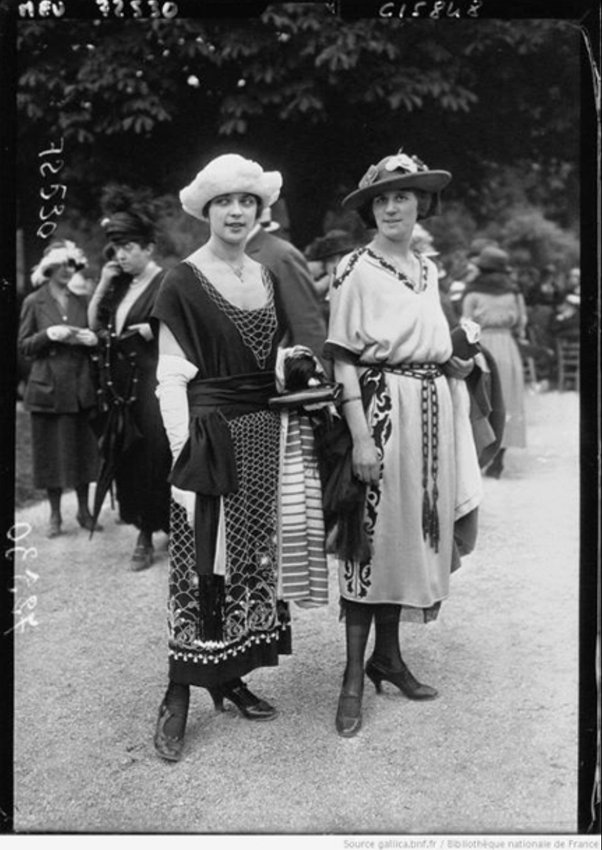 French high fashion, about 1919 or 1920. The lighter colored dress is daringly short, but that length will soon be popular.