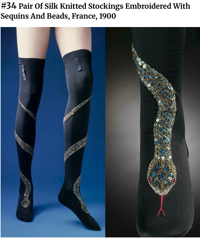 A small design in beading or embroidery, or sometimes an openwork pattern, was fairly common on one’s fancy or dress-up stockings from the late Renaissance all the way through the early 20th century, but it was usually confined to the outside of the ankle, and was called, for some reason, “clocking”.