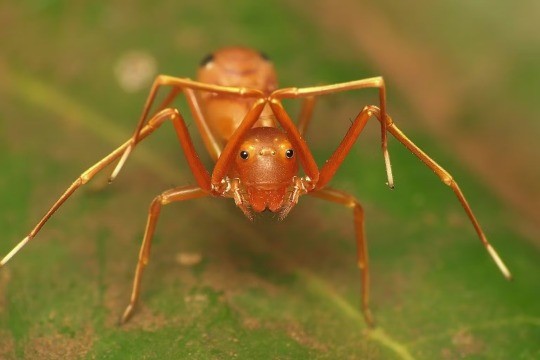 According to Wikipedia, the ants don’t notice that the larger crab spider “ant” has its eyes and antennae at opposite ends of its body. Or that the spiders are hanging off the twig they’re walking on by a thread, rather than being part of their group.