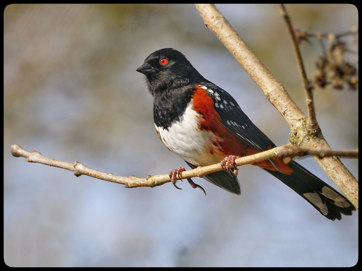 Male Spotted Towhee in breeding attire with white tail spots.