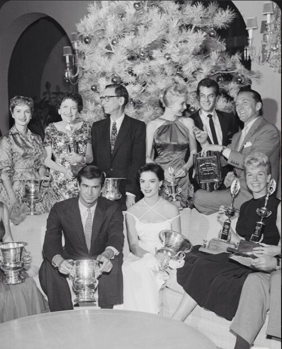 Left to right; Front row; Victoria Shaw, Tony Perkins, Natalie Wood, Doris Day, holding her award and also award she accepted for Frank Sinatra, King Vidor; who accepted the award for Audrey Hepburn.