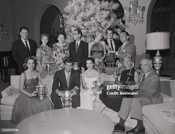 Left to right, back row: director George Stevens, Debbie Reynolds, Louella Parsons, George Delacorte, publisher of Modern screen, Janet Leigh, Tony Curtis and Kirk Douglas.