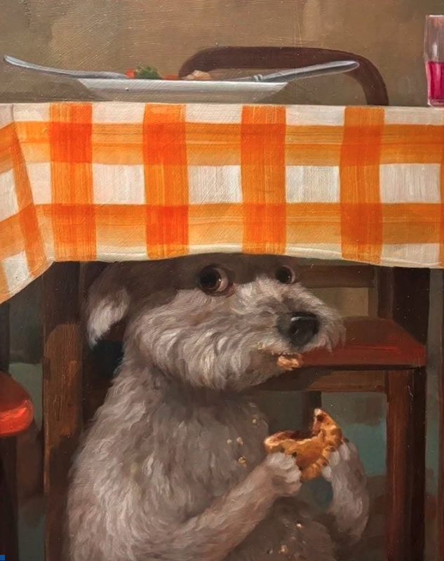 This is the same cat as yesterday, isn’t it? The one who was wistfully looking at those slices of not-tomato. What does this artist do that doesn’t involve putting his (or someone else’s?) cat in a state of anguish?