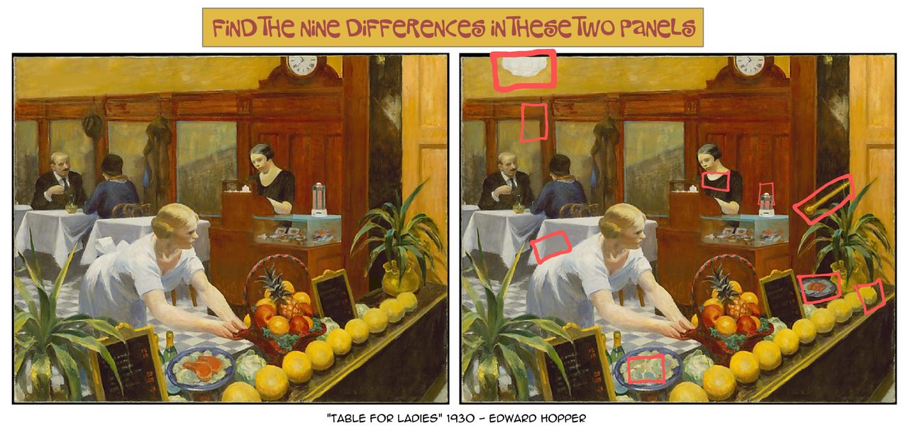 This week’s puzzle is a Hopper painting of a beautiful restaurant… Well, I think it’s beautiful, anyway.