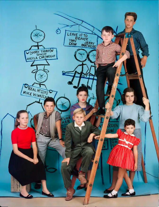 “This CBS promotional photo shows the young stars of the 1962 tv season including Tony Dow and Jerry Mathers (Leave It To Beaver), Angela Cartwright (The Danny Thomas Show), Mike Winkelman (The Real McCoys), Noreen Corcoran (Bachelor Father), Bobby Clark (Casey Jones) and Karen Green and Gail Stone (The Eve Arden Show).”