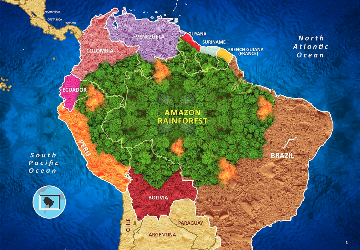 What do the orange areas among the rainforest signify?