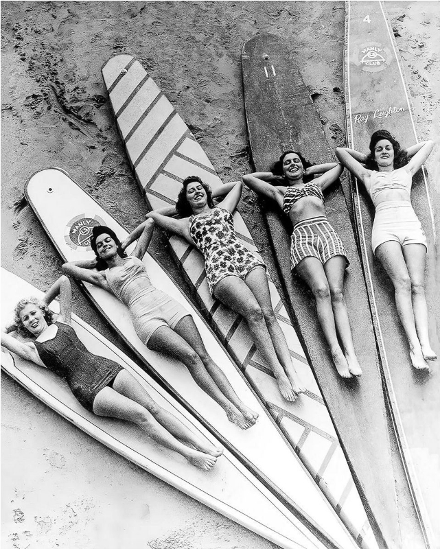 The caption I found on a surfing forum says “Pat Crum, Lillian Galvin, Pam Toyer, Pam Inch and (Lillian’s sister) Dorothy Galvin on hollow boards at Manly Beach, near Sydney, Australia”