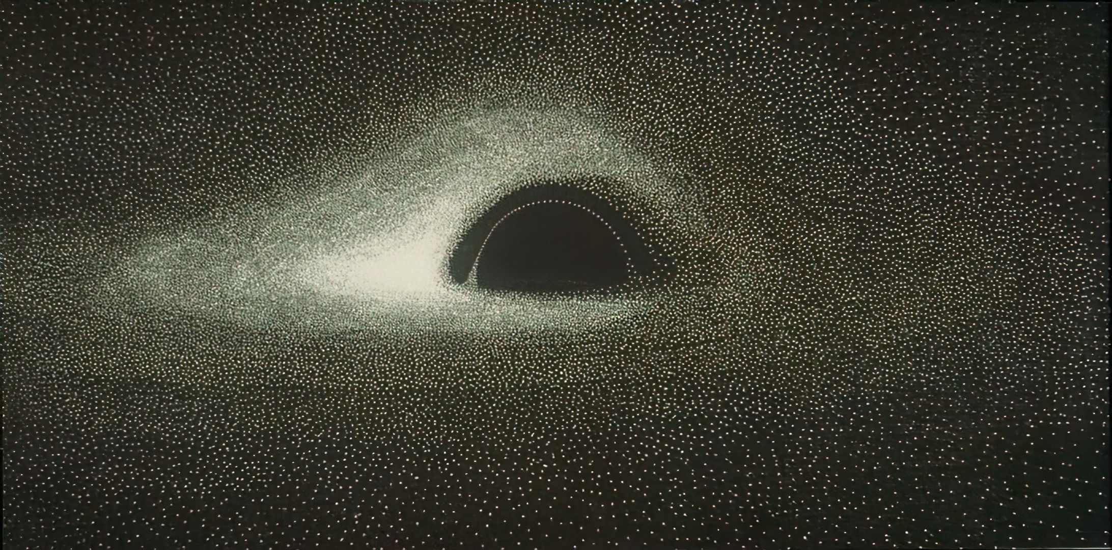 The first simulated image of a black hole. Calculated with an IBM 7040 computer using 1960 punch cards, and hand-plotted by French astrophysicist Jean-Pierre Luminet in 1978.