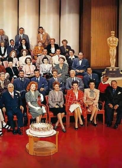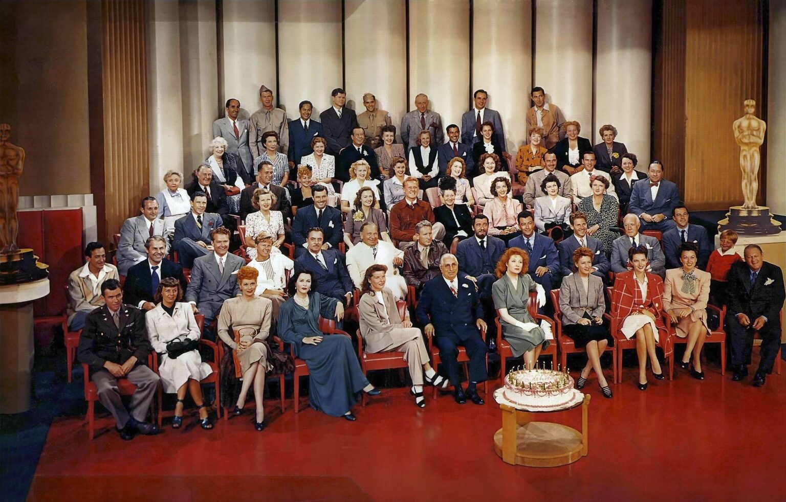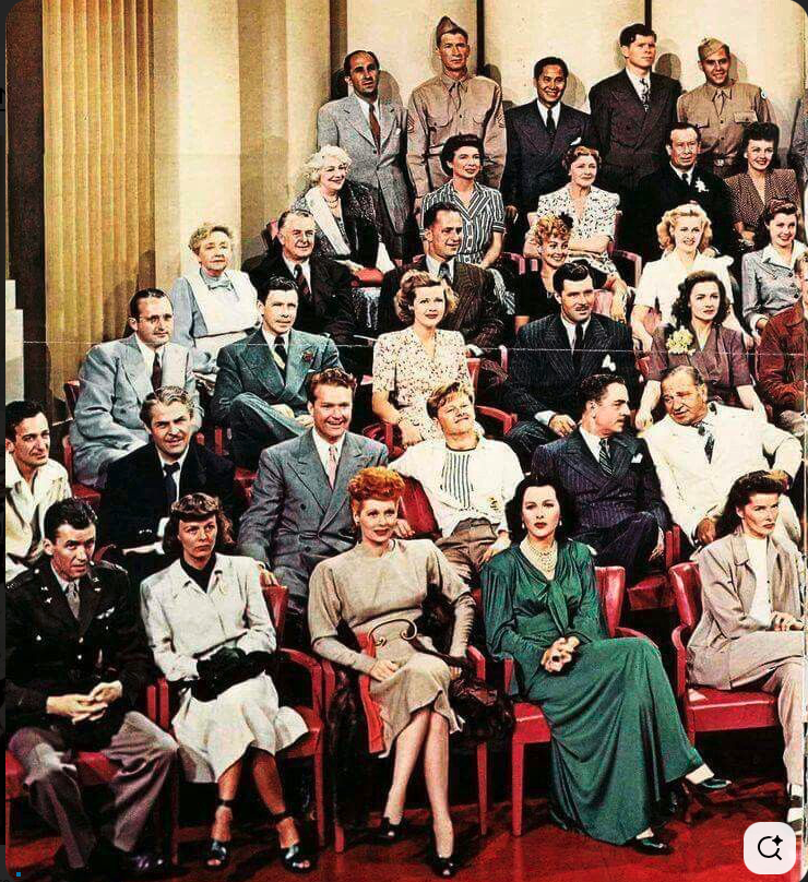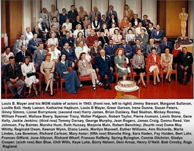 Front Row: James Stewart, Margaret Sullavan, Lucille Ball, Hedy Lamarr, Katharine Hepburn, Louis B Mayer, Greer Garson, Irene Dunne, Susan Peters, Ginny Simms, Lionel Barrymore