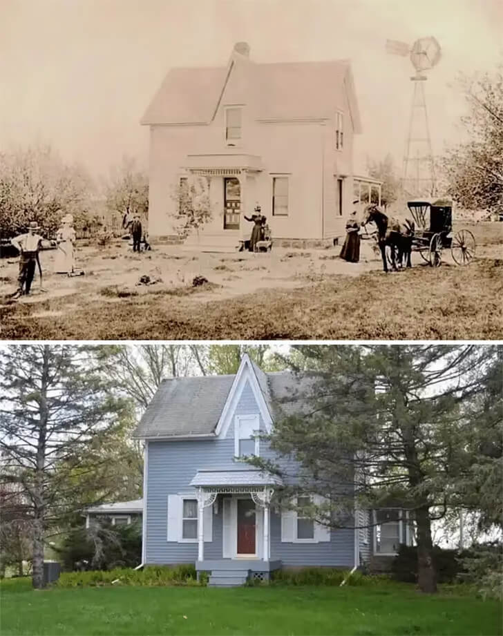 For the last 41 years I worked for a company that makes porch posts and columns. One of my jobs was to take old photos like the one on top, and make CAD drawings of the posts/columns for recreating them as close to the originals as possible. Sometimes they had to pass inspection by historical societies – those could be a real pain in the…umm…computer mouse. So I love this old/new photo set. (Oh – think how long it took to grow those trees!)