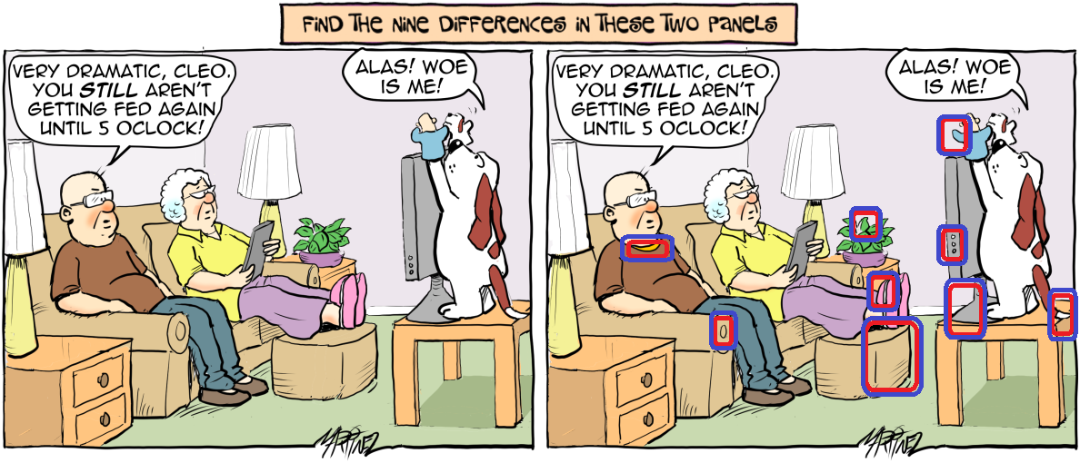 Just as Cleo’s little play shows a few differences from reality, Panel 2 shows some differences from Panel 1.