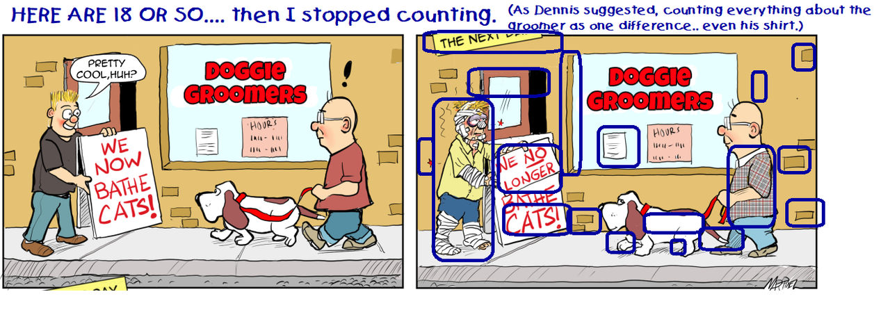 I found others: 1. the lettering in “bathe”; 2. the dog’s smile; 3. curb detailing on sidewalk; 4. sign on right side of window (writing looks different); 5. dog-walker’s left leg moved; 6. dog-walker’s pants are different; 7. dog-walker has one more hair atop head; 8. window is lower; 9. door is lower; 10. sidewalk is lower; 11. only one “dividing line” on sidewalk, where “we now/we no longer bathe cats!” sign is; 12. cartoonist’s signature in second panel!