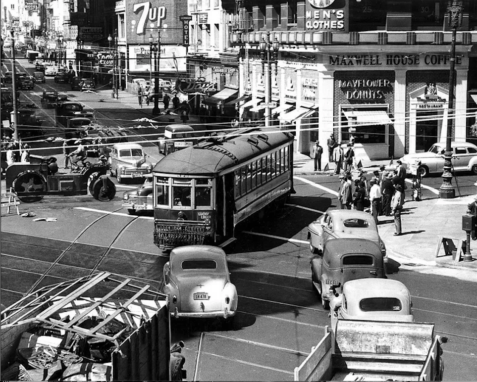 Dunno why I didn’t Google it first… my results all say some version of cable car in traffic, downtown San Francisco, ca 1948.