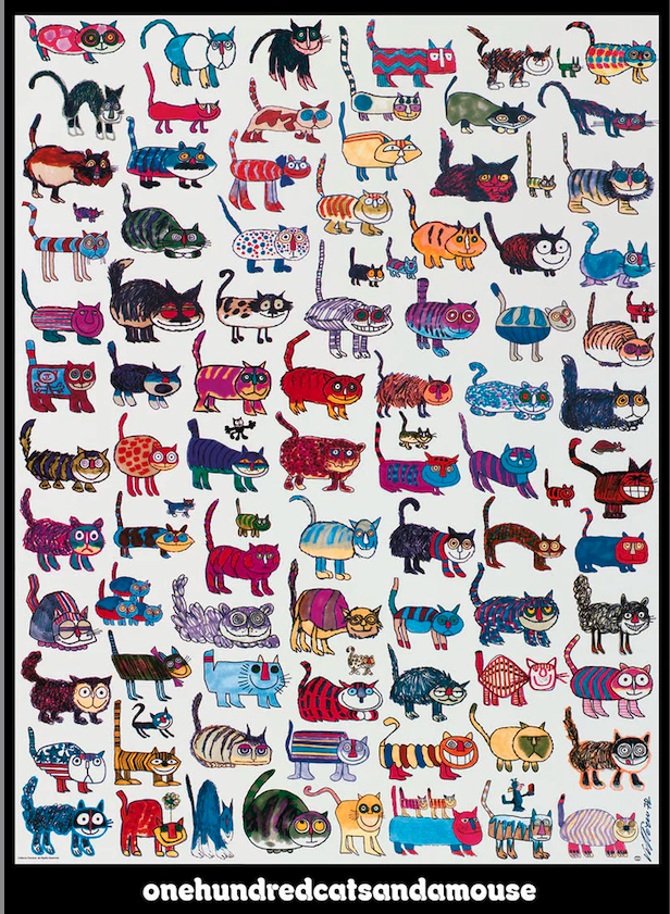Count 7 cats, down from the top, to a big gray one… Between him and the devilish red one below him, is a plain little brown mouse, who looks nothing like Ignatz, so I was confused.