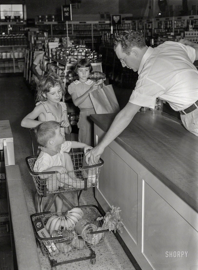 “September 1938. “Children buying groceries in co-op store. Greenbelt, Maryland.” Medium format negative by Marion Post Woolcott.”