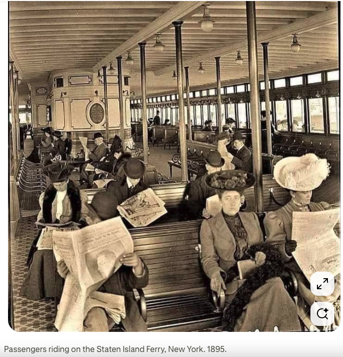 Hats for everybody. Furs. Spaces between groups as has always been common. Ladies don’t seem to be traveling alone. Couldn’t make out what was on the newspaper. Just trivial scanning. Notice anything else?