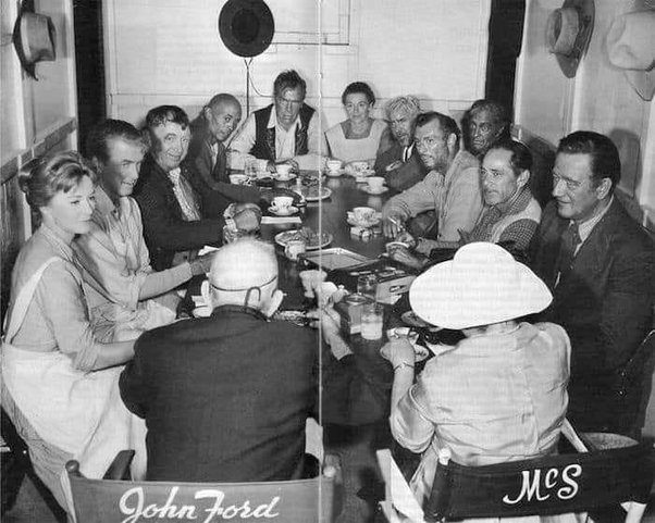 Must be the cast from The Man Who Shot Liberty Valance. I’m not going to get them all, but I see Jimmy Stewart, John Wayne, Lee Marvin, Woody Strode, Lee Van Cleef, Edmond O’Brien, & Vera Miles. John Ford directed.