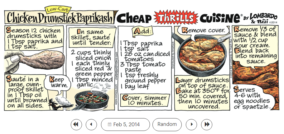 1. ‘American Pie,’ 2. ‘Angie Baby,’ 3. ‘Apache,’ and 4. ‘Aqualung,’ and the ‘Cheap Thrills Cuisine’ recipe 5. ‘Chicken Drumstick Paprikash (low carb).’