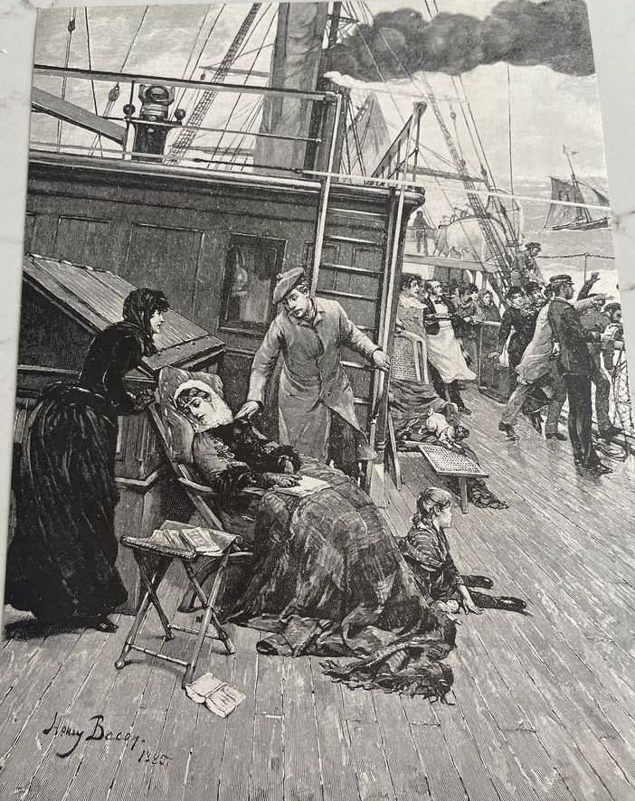 Looks like a very dramatic scene. Passengers and crew on deck during a storm on a treacherous sea. Does that signature say “Honey Bacon. 1885”?