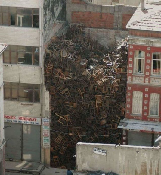 1500 chairs stacked between two buildings is meant to evolve faceless victims of oppressive governments, including immigrants.