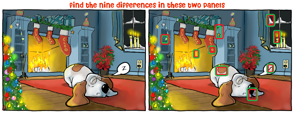 Now that the solution has been provided, I feel free to make another observation about the drawing. See the ornaments hanging in front of the cabinet at the far side of the room, next to the fireplace? To me, they resemble eyes staring out the window. Note: This is NOT one of the diffs, hence no spoiler alert.
