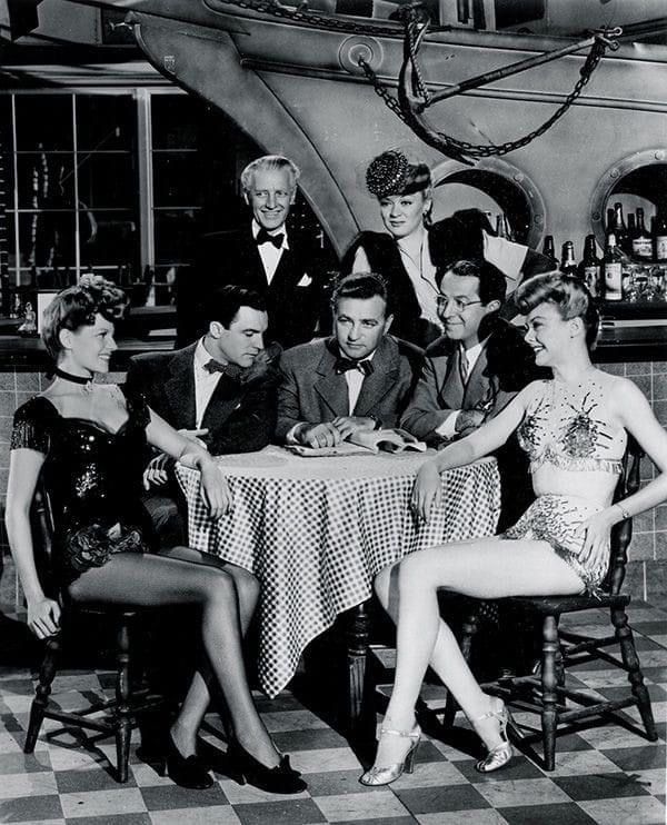 Rita Hayworth, Gene Kelly, Phil Silvers, and Jinx Falkenburg, with Eve Arden standing behind them.