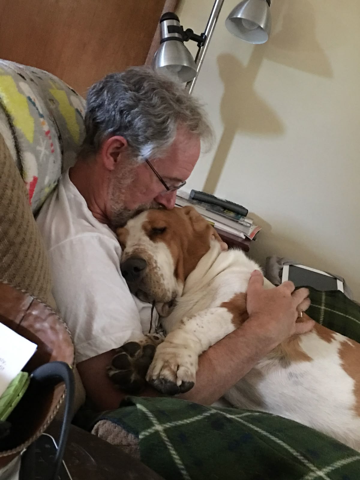 Bassets do tend to be quite snuggly. Mine will stay with me for hours like that.