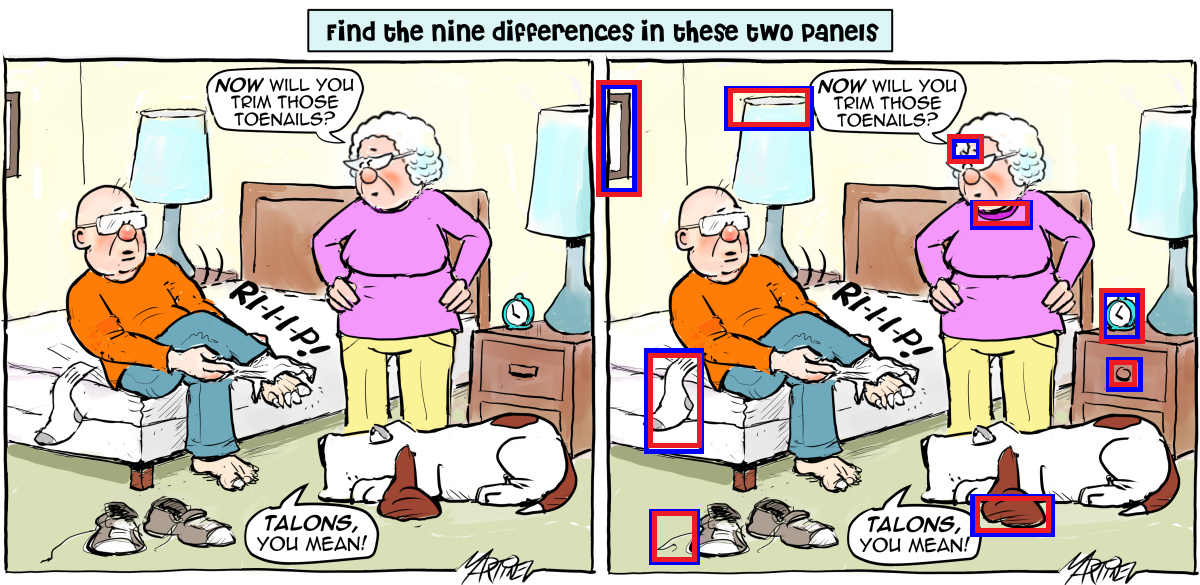 We have ten of them in the two panels above (Claude talons, I mean), and nine differences… I don’t think it’s a spoiler to say that none of the differences involve Claude having gone for a pedicure.