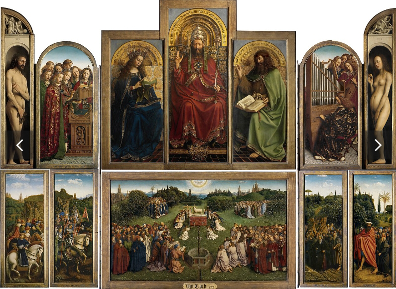 The whole altarpiece is thought to have been laid out and started by Jan Van Eyck’s older brother, Hubert, but either finished or wholly painted by Jan, a more famous artist, in 1432.