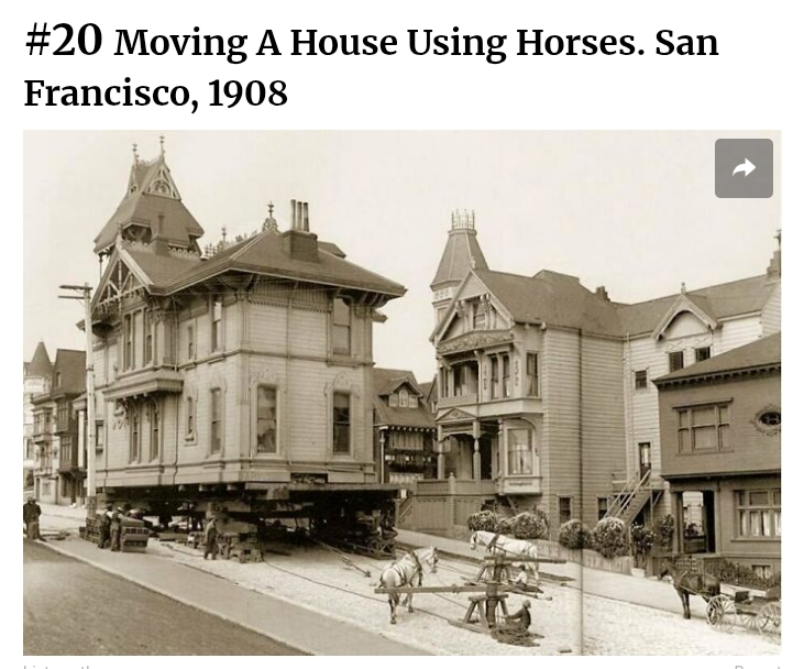 I’ve seen pictures of teams of sturdy draft horses moving small houses or cabins… but here are what look like two carriage horses moving a mansion, with some sort of rotary contraption.