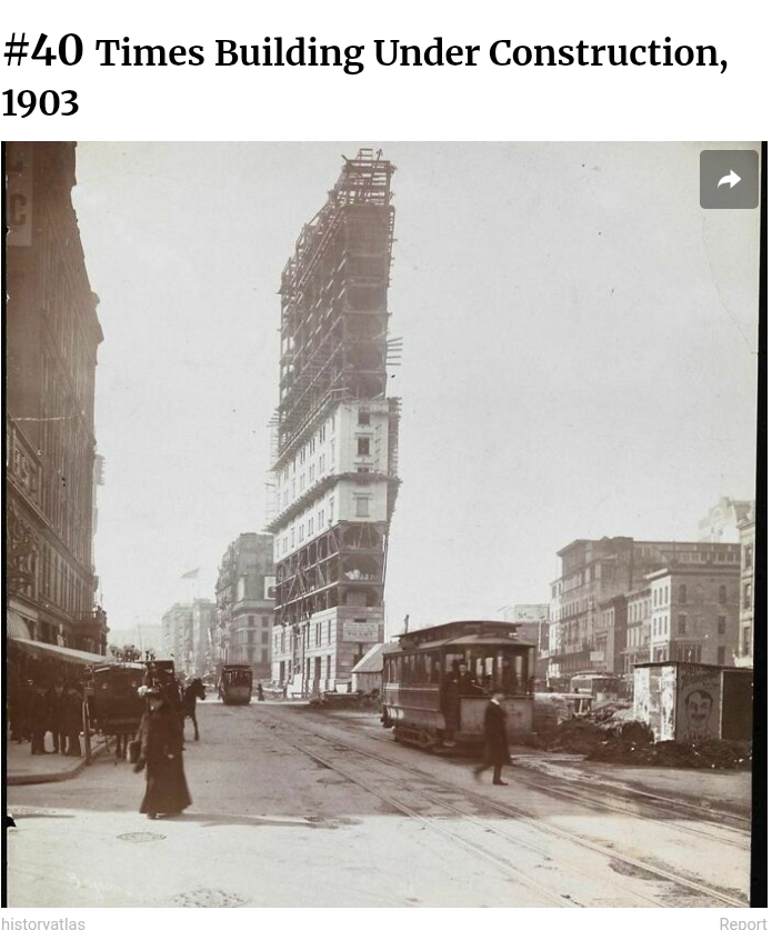 It was built by and for The New York Times, but that big sign on the narrow end says “To Let”. That’s because the Times didn’t use the retail spaces at ground level, but rented them for stores.