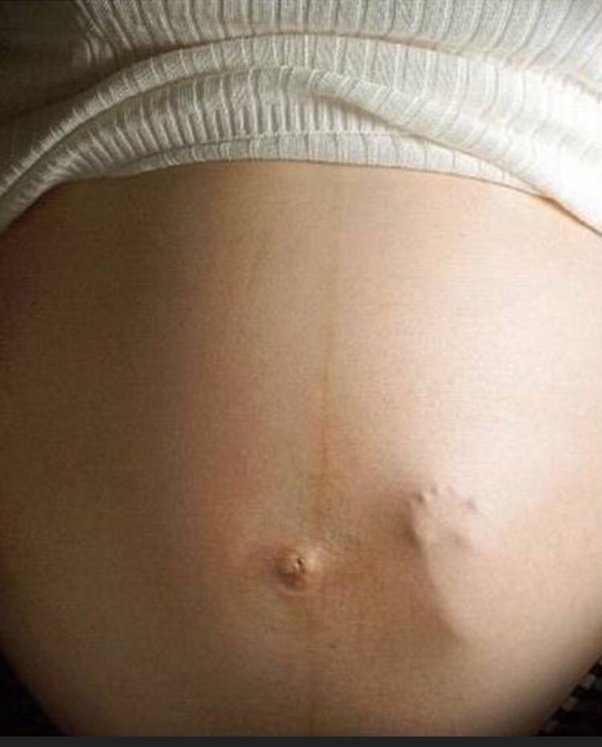 Remember, there’s her womb and all her abdominal muscles in between that little foot and mama’s skin.
