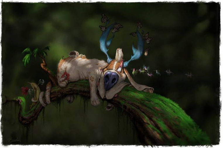 Especially not off of sweet, innocent Rosebud, the last Basselope, pictured cuddled up on a tree branch with some furry friends, trying to get a night’s sleep.