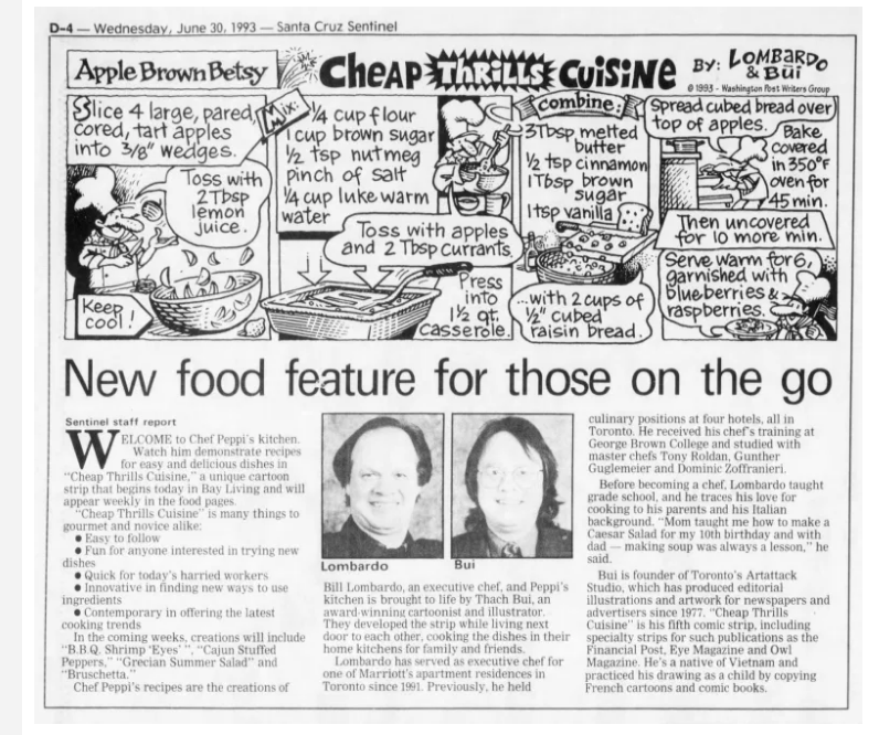 An article from the Wednesday, June 30, 1993 – Santa Cruz Sentinel about Cheap Thrills Cuisine (I had forgotten its origins were Canadian).