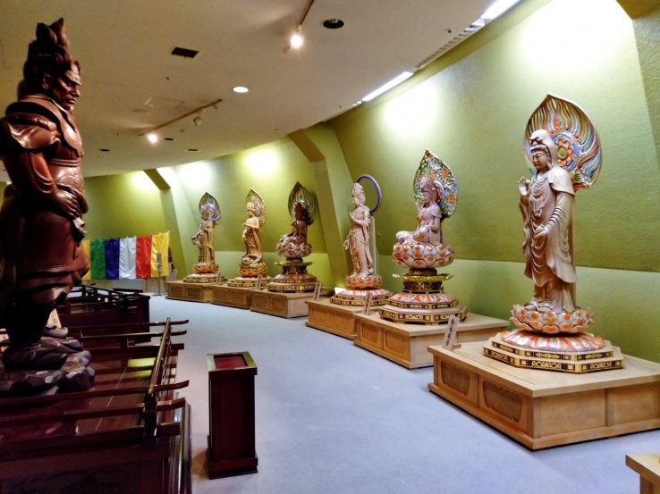 For a small fee, you can enter the statue itself. On the first floor are large statues of Buddha and mythical kings. You can walk or take an elevator to the 12th level … then walk down the ramps to the ground. At each level, there are eight Buddhas displayed in wooden cabinets.