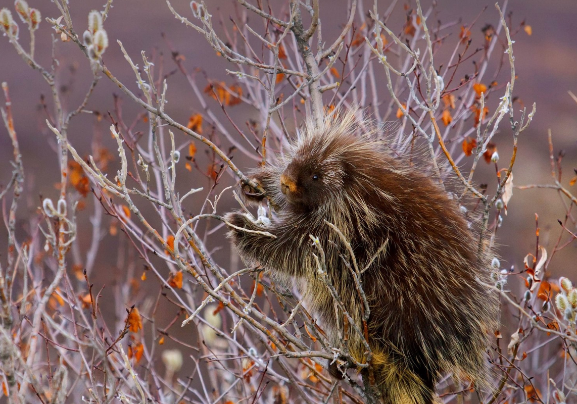Porcupine hanging on a willow tree branch in Alaska.