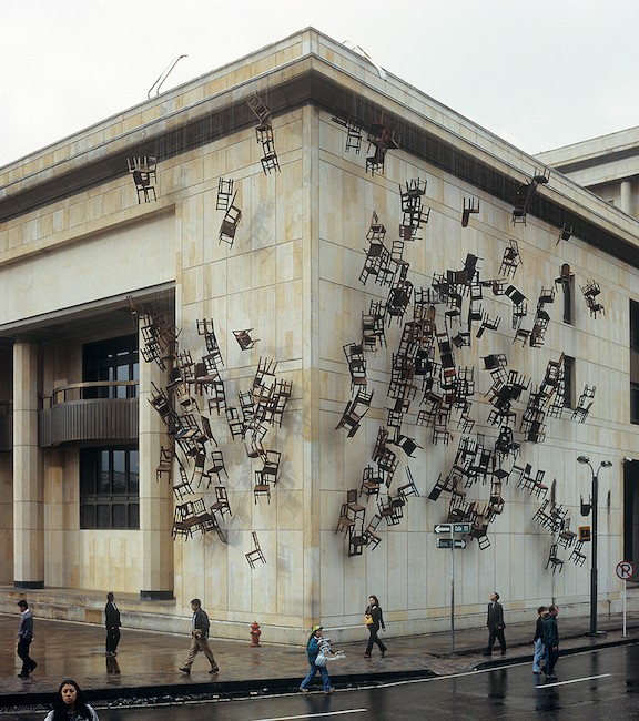 This one is called Noviembre 6 y 7 (November 6 and 7), using 280 wooden chairs, attached to the Palace of Justice, Bogotá.