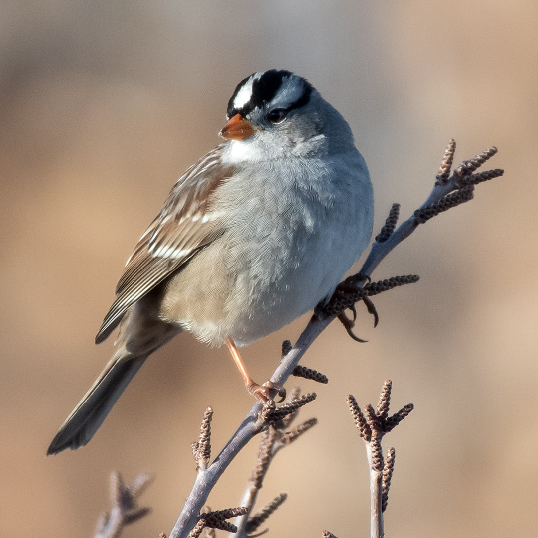 A white-crowned sparrow (Zonotrichia leucophrys) in the morning light.