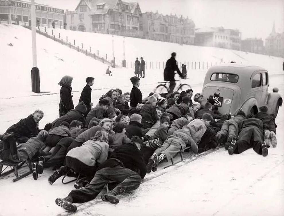 Boys and girls on sled’s (sled) can be pulled over the snowy street by a passenger car in Scheveningen. Netherlands, date unknown.