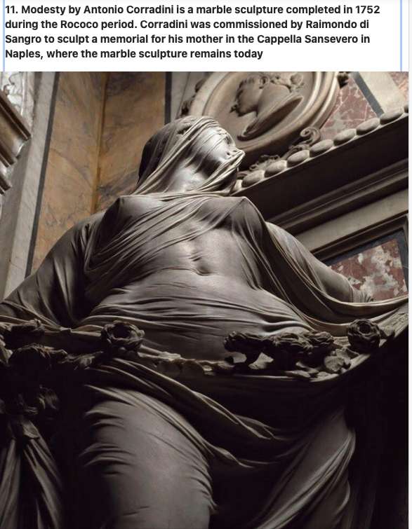 All that (exceedingly modest, of course) sheer drapery is carved out of the solid marble… necessitating figuring out not only where the nose will be, or an eye, or the curve of a breast, but envisioning also where the folds of the thin, translucent material will drape and stretch across it….